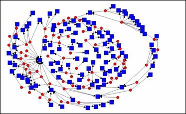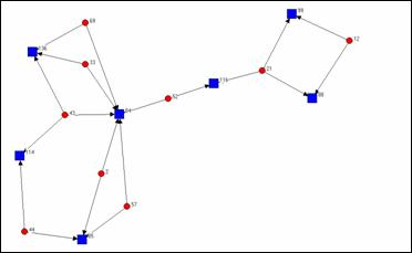 Los círculos rojos son las organizaciones de la red, y los cuadros azules las organizaciones del entorno.