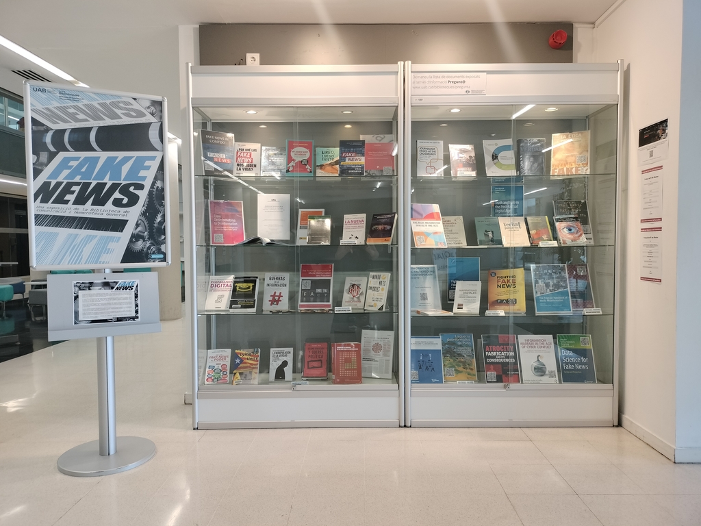 Exposició presencial de la Biblioteca de Comunicació i Hemeroteca General on es mostren documents sobre les notícies falses i temes relacionats com ara la desinformació, la verificació de notícies i el paper dels periodistes.