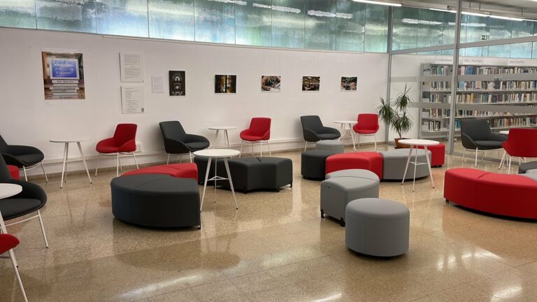 Per aquest motiu vam avaluar la incorporació d’un nou mobiliari més amigable dins la filosofia “sofseating” amb sofàs i pufs de colors, en la línia d’adaptar-nos a les necessitats dels nostres estudiants, per tal que poguessin gaudir d’uns moments d’esplai mentre fullegen uns apunts, es connecten al portàtil o fan una petita becaina al migdia, per què no?