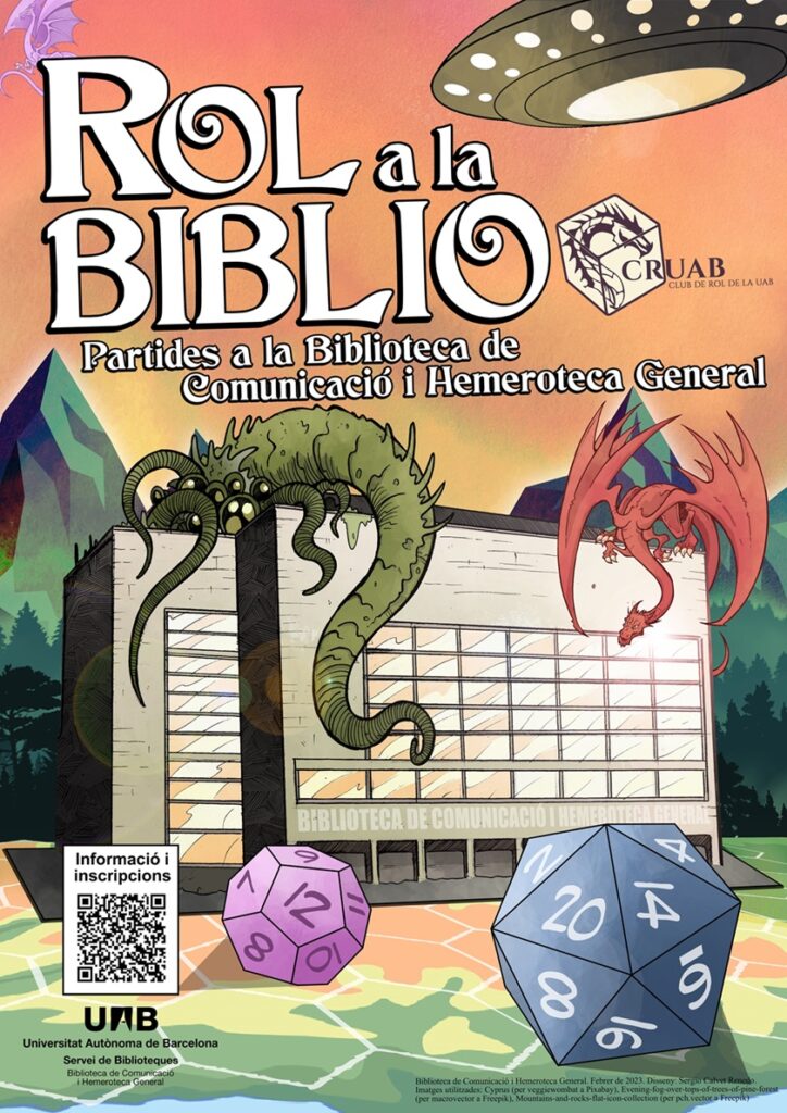 El febrer de 2023 la Biblioteca de Comunicació i Hemeroteca General anunciava la primera edició del “Rol a la biblio”. D’aquesta manera, començava una col·laboració amb el Club de Rol de la UAB (CRUAB) per organitzar partides de jocs de rol de taula dins dels espais de la biblioteca.