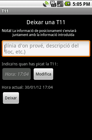 Per tal d'indicar on hem deixat una T-11 ens caldrà tenir el GPS del telèfon actiu, ja que aquesta és la manera com l'aplicació posiciona la T-11 i la resta d'usuaris la poden localitzar. L'aplicació ens mostra una pantalla per donar informació de la T11 que deixem.