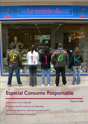 Para el siguiente curso contábamos con el precedente del curso anterior. Y aunque los éxitos precedentes no garantizan los futuros, sí se produce una corriente de ánimo inversor (como bien saben los anunciantes de productos bursátiles). Así no costó demasiado convencer a los cinco integrantes del equipo FLICK (son las iniciales de los nombres de los alumnos participantes) de que podían conseguir un buen rendimiento de su trabajo conjunto. El esfuerzo podía ser recompensado, así que merecía la pena intentarlo. Pronto nos pusimos manos a la obra. Este año la primera fase consistía en un recorrido virtual por distintas estancias: habitación, cocina, comedor, cuarto de baño, tiendas, etc., con la misma mecánica que el curso anterior; cuestiones y fichas pedagógicas relacionadas con datos ocultos que era necesario buscar por Internet. La segunda fase consistía en la realización de una revista con temas referidos al consumo. La revista debía contener una entrevista con algún personaje relevante (en términos del consumo), el resto debían ser contenidos frecuentes de las revistas como una editorial, artículos de opinión, pasatiempos, publicidad, etc. Todo ello en un total de 16 páginas.
