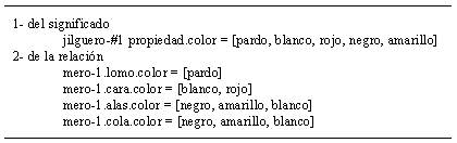 Se han señalado1 atributos cuyos valores constituyen clases cerradas o incluso valores binarios (como canónica frente a facultativa2) pero no se han considerado otro tipo de atribuciones cuyos valores constituyen clases abiertas (como cantidad, cualidad, tamaño, forma, etc.). Está comúnmente aceptado que los significados léxicos poseen propiedades y relaciones. Por ejemplo, el hecho de que un jilguero cante constituiría una relación télica entre «jilguero» y «cantar», ahora bien, el hecho de que un «jilguero» sea de un color determinado parece más bien una propiedada o atributo de «jilguero» (independientemente de que se represente utilizando otro tipo de entidad de representación, además de clase o instancia, como son la propiedades: etiquetas de una clase cerrada que caracterizan a las unidades semántico-léxicas).