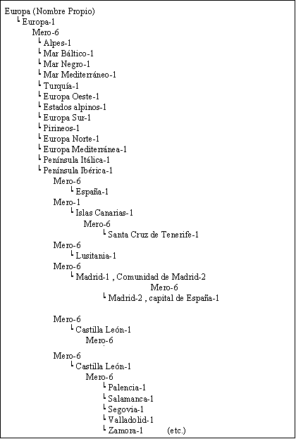 Por último, queremos proporcionar el ejemplo de una jerarquía parcial muy sencilla, pues corresponde a instancias de nombres geográficos. Como veremos, los mecanismos de transitividad y herencia son nítidos en las meronimias lugar-área, ya que está muy próxima a la inclusión espacial. De hecho muchos autores no consideran estas relaciones como meronimias, sino como inclusión espacial.