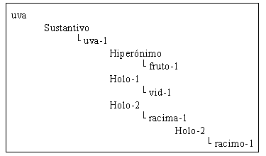 También podemos considerar el siguiente ejemplo de meronimia miembro-colección como poseedora de tres niveles de meronimia, lo cual no es nada común, e incluso transitiva: racima->racimo->uva