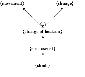 Véase en el ejemplo dispuesto en la fig. III.4 como el uso de dicho recurso permite codificar en la base de datos un único sentido de los conceptos {change of location}, {rise, ascent} y {climb} por el método de conectar el nodo superior, {change of location} como hipónimo conjuntivo de {movement} y {change}, dando así cuenta de que un [cambio de localización] implica necesariamente tanto un [movimiento] como un [cambio] . En WordNet 1.5 la solución adoptada consiste en la existencia de dos sentidos diferenciados para, cada miembro de la cadena {change of location}, {rise, ascent} y {climb}, siendo una cadena hipónima de {movement} y otra de {change}.