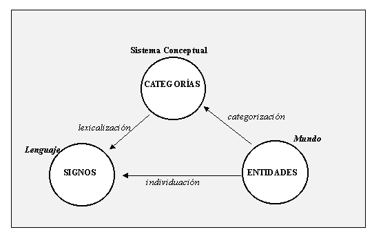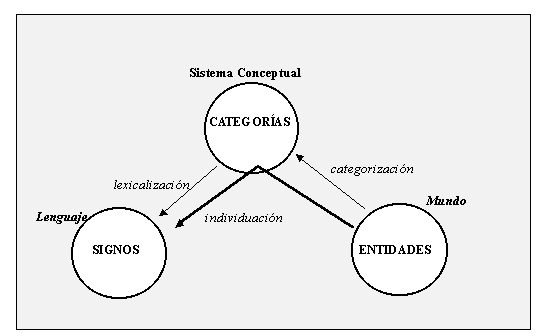 En consecuencia, situándome en un marco cognitivista, distinguiré entre los tres términos a partir de un triángulo mundo<--> sistema_conceptual<--> lenguaje, al estilo de la fig. I.4, en el que se entiende por mundo el mundo real y por sistema conceptual el de las categorías mentales (o clasificación del mundo real), incluyendo lenguaje tanto el significante como el significado de los signos y expresiones. Categorización, individuación y lexicalización deben ser entendidas como funciones que ponen en correspondencia objetos pertenecientes a alguno de dichos polos: entidades, categorías (o conceptos) y signos lingüísticos (léxicos o complejos), tal como se muestra en el esquema de la fig. IV.1.