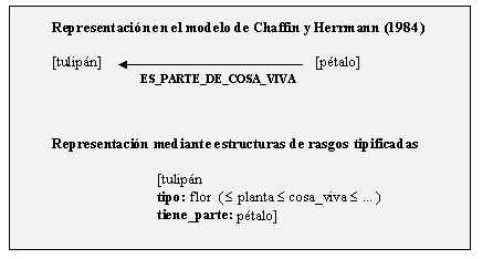 En el primer caso ello es debido a que se opta por un número reducido de esquemas conceptuales que subsumen las múltiples relaciones postuladas por Chaffin y sus colegas. Recordemos que Iris et al. postulan (vid §2.2.1) las relaciones ComponenteFuncional-Todo, Miembro-Colección, Segmento-Todo, e Inclusión de Conjuntos (taxonomía).