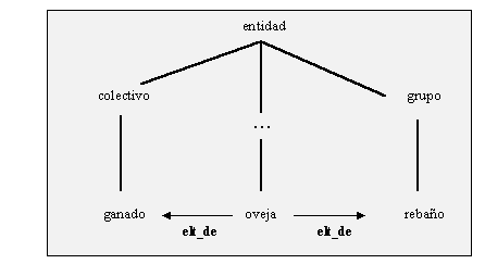 La segunda relación de WCH1987, Miembro-Colección, corresponde exactamente al esquema elemento-multiplicidad: una entidad concebida como amalgama o agrupación de múltiples elementos de un mismo tipo. La diferenciación de CH1988 entre Colección-Miembro ('ganado' - 'animal') y Grupo-Miembro ('rebaño' - 'animal') es directamente inferible del tipo de entidad inclusiva: colectivos (o, según la terminología que se adopte, agregados) frente a grupos, representable en la taxonomía. El sistema de tipos que propondré (ver §6) incorpora esta distinción básica, a partir de las distinciones definidas en el modelo de Jackendoff (1991) -ver §2.2- entre conceptos delimitados y no delimitados. En líneas generales, los grupos ('rebaño', 'equipo') son concebidos como entidades cerradas o delimitadas en el espacio, el tiempo o el número de componentes; mientras que los agregados ('gente', 'ganado') no sufren tales delimitaciónes.