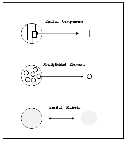 Vistos los modelos presentados en §2, creo que es posible representar la multiplicidad de relaciones que se postulan únicamente mediante tres esquemas merológicos fundamentales: parte-entidad, elemento-multiplicidad, y materia-entidad.