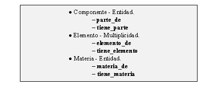 Las dos primeras corresponden a Componente-Entidad y Elemento-Multiplicidad de mi propuesta. La Inclusión de Conjuntos, o relación taxonómica, no la trato en este trabajo como una de las relaciones merológicas. La organización jerárquica de un lexicón basándose en la relación de hiponimia es considerada, como suele ser habitual (p.e. vid modelos de Cruse, 1986) un tipo de relación diferente a las relaciones de parte.