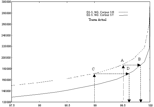 Si se observan los puntos A,B ,C y D podemos deducir que los umbrales de recorte calculados con las constantes obtenidas utilizando los datos de entrenamiento son claramente conservadores. Ello es debido a que la dispersión de las distancias de los estados del espacio de búsqueda es mayor al existir un mayor número de datos (el conjunto de datos de entrenamiento es 6 veces mayor que el conjunto de evaluación).