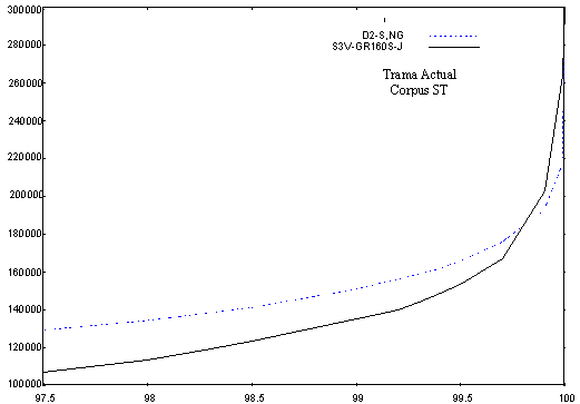 Fig. 5.14 Evolución del valor de las constantes de recorte calculadas para distintos factores de conservación para los histogramas calculados con los datos de evaluación para dos sistemas de calidad diferente. Uno de ellos utiliza gramática (GR160S-J) y modelos semicontinuos de 3 codebooks (S3V) y el otro utilkiza sólo modelos discretos de 2 codebooks (D2).