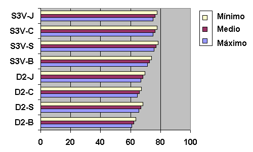 Fig. 5.20 Diagrama donde se observa el valor mínimo, medio y máximo (banda de probabilidad) para cada uno de los sistemas (D2-B, D2-S, D2-C, D2-J, S3V-B, S3V-C, S3V-S, S3V-J). Representación gráfica de la tabla 5.24.
