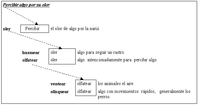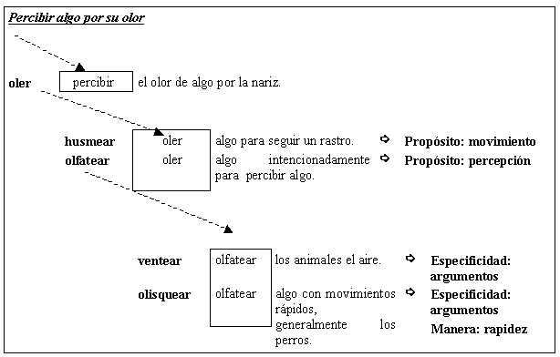 Lo que diferencia husmear de olfatear es el propósito, mientras que en el primero es el movimiento, en el segundo es la percepción. Los hipónimos de olfatear se diferencian entre sí por la concreción de los argumentos, en primer lugar: los animales (ARG1), el aire (ARG2) en el caso de ventear; generalmente los perros (ARG1), cualquier cosa (ARG2), en el caso de olisquear, y, en segundo lugar, por la manera, sólo en el caso de olisquear.