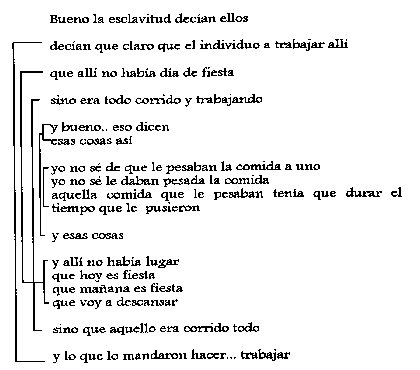En el segundo fragmento, el uso de la coordinación muestra que basta con contraponer los hechos de la realidad, como muestra de la incompatibilidad. Además, se yuxtaponen las dos preguntas hacia un interlocutor que no es sólamente el oyente: se añade la interpretación a esa otra voz a quien se increpa, que es a la vez el investigador, Carlos Andrés Pérez y quien quiera que sea que pueda velar por la justicia en el mundo: ayer...perdóneme, ayer fui a cobrar... dos mil bolívares yo, los cobré, y llegó un obrero, que lo conozco yo, y cobró.. veinticinco mil bolívares... barriendo... barriendo, bueno yo estoy de acuerdo que... que sí... se caractericen, que se... que se... se... confronte todo con un obrero, está bien, yo estoy de acuerdo con todo eso, pero que también... es mucho sueldo...