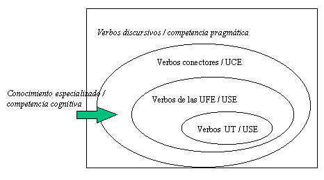 Distinguimos la noción de UCE, perteneciente al nivel cognitivo, de la noción de USE de carácter lingüístico. De manera que una USE siempre será una estructura gramatical bien delimitada (un morfema, una palabra, un sintagma o una oración). La correspondencia entre USE y UCE no se da necesariamente uno a uno. En este sentido, los verbos conectores que no constituyen USE per se, sí que conectan USE y forman parte de UCE, ya que la relación expresada por el verbo entre una USE y otra forma parte del saber especializado. Los verbos fraseológicos, por su parte, tampoco son USE per se, pero funcionan como núcleo gramatical de una cierta clase de USE, las UFE. Finalmente, los verbos terminológicos pueden formar parte de USE superiores, pero también constituyen USE por ellos mismos, por lo que podemos considerarlos UT.