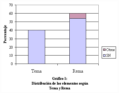 En las cláusulas, generalmente, hay un elemento que tiene la función del Tema y uno o más que tiene la del Rema ya que, en muchos casos, para expresar "lo que se dice" del Tema se necesita más de un SN u otro elemento. En el cuadro (1) y en el gráfico (1)se puede apreciar la distribución de los elementos (SN y otras clases de palabras) respecto al Tema y Rema:
