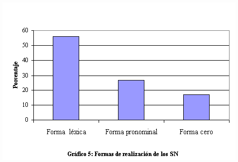 Los datos revelan, que la realización más usada es la de los SN léxicos (56%). Los SN realizados como forma pronominal o cero, sin embargo, alcanzan juntos un 44%. Entre ellos, los pronombres son más frecuentes (27%) que los elementos cero (17%) ya que los últimos solo se dan en el caso de los pronombres sujetos donde el "predicado verbal ‘contiene en sí al sujeto...’ " (Gili Gaya 1968 : 23).