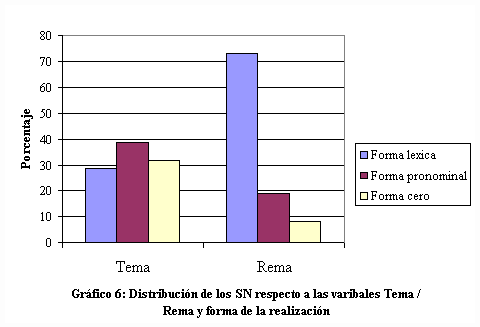 Al contrario, en el Rema, los hablantes utilizan más SN léxicos. Esto no puede ser de otra forma porque para lo que se quiere decir del Tema hace falta, en muchos casos, un SN realizado de esta forma ya que aparece por primera vez o solo una vez, como ilustra el ejemplo: