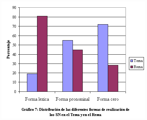 En el cuadro 9 y el gráfico 7 se puede observar la misma tendencia pero con más claridad. Los SN realizados como pronombres o elementos cero son más propicios de aparecer en la función temática. Muy marcada se presenta esta tendencia para los elementos cero que, considerados solos, muestran un porcentaje de 72%. Este hecho parece deberse a que se trata de pronombres sujeto y, como veremos más adelante, los sujetos tienden a cumplir función temática. Los demás pronombres (personales, relativos, indefinidos, excepto los demostrativos) cumplen también funciones sintácticas diferentes, típicas de las que aparecen en el Rema. Por esta razón, el porcentaje de ellos en el Tema no es tan alto aunque las cifras corroboran la tendencia. Al contrario, se evidencia con claridad que los SN léxicos tienden a cumplir función remática (81%).