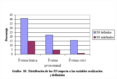 El cuadro y el gráfico reflejan que los SN definidos pueden realizarse tanto como SN léxicos como formas pronominales o cero. Al contrario, los SN indefinidos tienden a realizarse como SN léxico. Considerado de otro punto de vista, los SN de forma pronominal o cero y sobre todo los últimos, generalmente, tienen referentes definidos y, excepcionalmente, referentes indefinidos. Si se da el último caso, los SN codificados como forma cero aparecen, generalmente, en una cláusula impersonal con el verbo en la tercera persona plural donde el sujeto es callado intencionadamente o carece de interés, como vemos en los siguientes ejemplos: