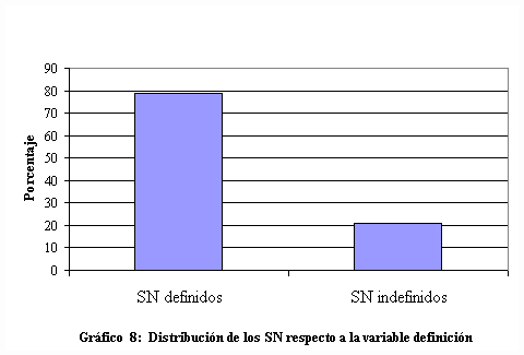El porcentaje de los SN definidos (79%) supera claramente el de los SN indefinidos (21%). En la mayoría de los hablantes las diferencias son incluso muy pronunciadas. Los SN definidos alcanzan en muchos textos más del 80%.