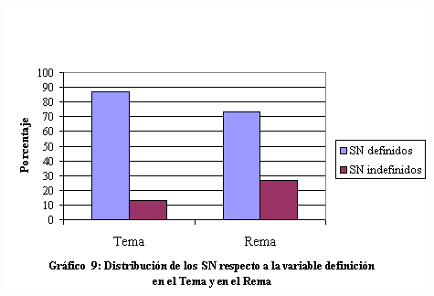 Resumiendo se puede decir que cuantitativamente, los SN definidos superan mucho a los SN indefinidos en un discurso cohesivo. Los SN definidos aparecen tanto en el Tema como en el Rema aunque el Tema es su dominio preferido. Los SN indefinidos, al contrario, muestran una clara tendencia de cumplir función remática. En la mayoría de los casos se realizan de forma léxica mientras que los SN en forma pronominal y cero tienden a codificar referentes definidos