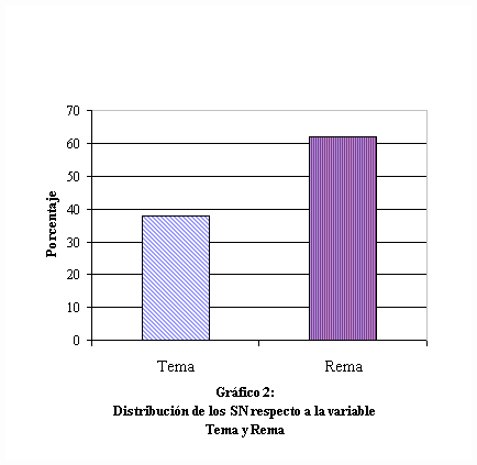En comparación con los resultados presentados en la Metodología, es decir antes de la eliminación de las cláusulas mencionadas, se observa una ligera variación respecto a la distribución de los SN según Tema y Rema. De los 1.250 SN, el 38% ejerce la función del Tema y el 62% la del Rema. Sin embargo, dicha variación no parece muy significativa. Podemos constatar, que, de nuevo, el Rema sobrepasa considerablemente el porcentaje del Tema, un hecho que tiene su explicación en la misma naturaleza del Rema, como ya se ha mencionado. De los datos se desprende que, en los discursos analizados, alrededor del 40% de los SN ejercen la función del Tema y alrededor del 60% de los SN tienen la función del Rema.