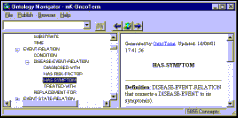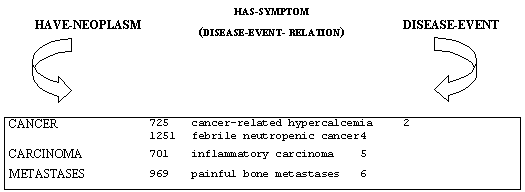 Así, el concepto HAVE-NEOPLASM se uniría a través de la relación HAS-SYMPTOM (SYMPTOM-OF) con aquellos eventos (incluidos los estados) que denoten la presencia de una enfermedad. La relación HAS-SYMPTOM cuenta con la siguiente definición: