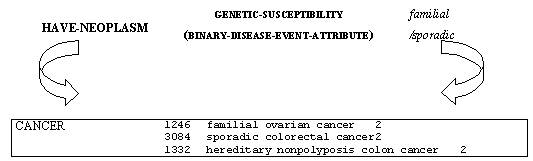 Como formalización alternativa del valor familial ('familial ovarian cancer'), se ha encontrado 'hereditary' ('hereditary nonpolyposis colon cancer') mientras que para el valor sporadic ('sporadic colorectal cancer') no se ha detectado ninguna posible variación.