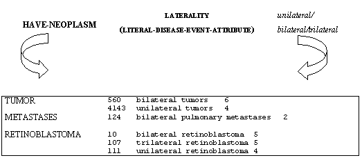 El atributo LATERALITY (LITERAL-DISEASE-EVENT-ATTRIBUTE) se ha añadido para estructurar aquellos FT que indican cuántos lados o unidades de aquellos órganos o partes del cuerpo que presentan dos o más divisiones (cavidad nasal, pulmones, huesos, senos, etc.) están afectados por el proceso neoplásico. La definición se ha formulado de la siguiente manera: