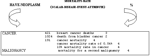 Una vez más, se observa que existen FT que no incluyen el valor del atributo ('cancer mortality', 'mortality for a second malignancy') y casos en que una unidad léxica de carácter no especializado como 'death' constituye una formalización de MORTALITY-RATE gracias a su coocurrencia con 'breast cancer' ('breast cancer death') o 'bladder cancer' ('death from bladder cancer'). En lo que se refiere a aquellos ejemplos que sí incluyen los valores del esquema, se observan estructuras sintácticas de dos tipos: