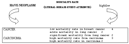 Se ha añadido también el atributo MORTALITY-RATE desde una perspectiva literal (LITERAL-DISEASE-EVENT-ATTRIBUTE), ya que la ontología no nos permite tratar valores escalares y literales bajo un mismo tipo de atributo. Como veremos, esta misma solución se ha tenido que adoptar en otras ocasiones. En lo que respecta al caso que nos ocupa, el atributo literal MORTALITY-RATE se ha añadido con la siguiente definición: