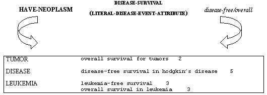 Los frasemas terminológicos que incluyen el valor disease-free lo hacen de dos formas. Pueden incorporar la realización del valor como tal añadiendo el nombre específico del proceso canceroso a través de un sintagma prepositivo ('disease free survival in hodgkin's disease') o pueden incorporar el nombre de la enfermedad sustituyendo el valor disease-free por un hipónimo ('leukemia-free survival'). En cuanto a los ejemplos que formalizan el valor overall, sus estructuras sintácticas sólo difieren en la preposición utilizada:
