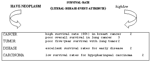 En esta ocasión se han elegido los valores literales high/low pero se han encontrado formalizaciones léxicas como 'excellent' ('excellent survival rates for early disease') o 'poor' ('poor overall survival in lung cancer'). Por otro lado, centrándonos de nuevo en el atributo SURVIVAL-RATE, obviando la recursividad, las estructuras sintácticas de los FT son muy parecidas a las del esquema anterior: