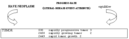 No hemos encontrado ningún ejemplo que incluya el valor slow. En el caso de rapid, los FT lo incluyen bien a través de un adverbio, 'rapidly' en 'rapidly progressive tumor' y 'rapidly growing tumor', o a través del adjetivo 'rapid' en 'rapid tumor growth'. Como vemos, además, los lexemas 'growing' y 'growth' aparecen en lugar de 'progressive' y 'progress', como formalizaciones léxicas del atributo PROGRESS-RATE.