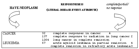 Los valores elegidos para este atributo han sido complete/partial/no response aunque en el corpus también aparece la variante 'complete/partial/no remission' ('lung cancer in complete remission'). Además, en los ejemplos de la tabla se pueden observar distintas estructuras sintácticas para formalizar el patrón conceptual: