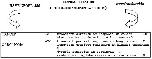 Finalmente, destacamos que, como en otras muchas ocasiones, aparece el fenómeno de la recursividad en FT como 'transient partial responses in lung cancer' y 'continuous complete remission in carcinoma' en donde se yuxtaponen el atributo RESPONSE-DURATION y RESPONSIVENESS (§5.3.3.31).