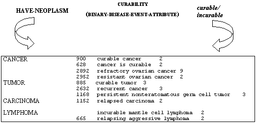 Los valores elegidos han sido curable e incurable. En el primer caso, la elección no presentaba problemas dado que esta forma léxica era la única que se daba en los escasos FT que hacían referencia a un cáncer curable ('curable cancer', 'curable tumor'). Esta ausencia de ejemplos en nuestro corpus no es fortuita, ya que entre los profesionales del ámbito oncológico se suele hablar de remisión de síntomas más que de curación dada la tendencia que tienen algunos tumores a recurrir tras la aplicación del tratamiento. En lo que se refiere al segundo valor del atributo, incurable ('incurable mantle cell lymphoma'), la decisión de elegir esta forma léxica como valor literal se ha tomado por razones de coherencia formal dentro del par de valores asignados, curable/incurable, ya que los ejemplos muestran una gran variedad de unidades léxicas que hacen referencia a estos tumores que se resisten al tratamiento, por lo que responderían al valor incurable. Así, se han encontrado casos como 'refractory' ('refractory ovarian cancer'), 'resistant' ('resistant ovarian cancer'), 'persistent' ('persistent nonteratomatous germ cell tumor'), 'relapsed' ('relapsed carcinoma'), 'relapsing' ('relapsing aggresive lymphoma') y 'recurrent' ('recurrent cancer') que es el más frecuente con diferencia.
