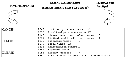 Tal como se puede observar en la tabla, los frasemas terminológicos pertenecientes a este esquema contienen gran variedad de unidades léxicas para describir la situación en que un tumor se encuentra localizado, en el lugar de origen, o se ha extendido a otros sitios tanto próximos como distantes. Los valores que se han elegido para el atributo son localized/non-localized y en torno a ellos se agruparían los distintos ejemplos. Así, al área de significado lexicalizada por el valor localized pertenecerían casos como 'localized' ('localized prostate cancer'), 'confined' ('confined prostate cancer'), 'local' ('local tumor'), 'limited' ('limited small cell lung cancer') y 'non-disseminated' ('nondisseminated posterior fossa disease'). En cuanto al valor non-localized, en torno a éste se circunscribirían los FT que contienen unidades léxicas como 'non-localized' ('nonlocalized tumors'), 'disseminated' ('disseminated testicular cancer'), 'extensive' ('extensive tumor'), 'regional' ('regional tumor') y 'distant' ('distant tumor'). Todos los ejemplos encontrados, como se puede ver, responden a una estructura sintáctica como la del siguiente ejemplo: