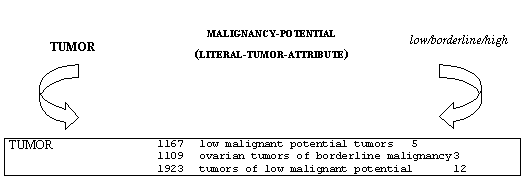 Como se puede ver, hemos encontrado dos tipos de formalización léxica del concepto MALIGNANCY-POTENTIAL, 'malignant potential' ('low malignant potential tumors') y el sustantivo 'malignancy' ('ovarian tumors of borderline malignancy'). Por otro lado, los FT de la tabla responden a dos patrones sintácticos: