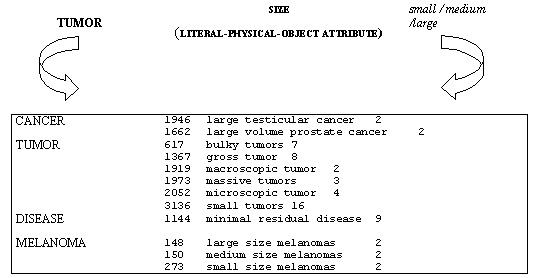 Los valores elegidos para el atributo literal SIZE han sido large ('large testicular cancer'), medium ('medium size melanoma') y small ('small tumors'), pero como se puede ver en la tabla 5.67, aparecen distintas formalizaciones léxicas como 'macroscopic/microscopic' ('macroscopic tumor', 'microscopic tumor'), 'massive/minimal' ('massive tumors', 'minimal residual disease'), 'bulky' ('bulky tumors') y 'gross' ('gross tumor'). Todas ellas se podrían agrupar en torno a los valores large y small.