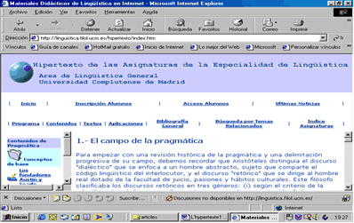 y otros proponen tareas relacionadas. En todos los documentos hipertexto se puede ir de un resumen a un ejercicio o a una lectura. La heterogeneidad de textos, propia de este discurso, se pone de manifiesto voluntariamente y tiene como prueba la apertura de una nueva pantalla que se superpone a la anterior.