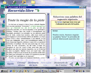 Como se desprende de la pantalla, los vínculos garantizan la coherencia de las estrategias de los aprendientes, dejándoles la iniciativa de la construcción de su propio saber. Los diferentes contenidos están organizados en archivos separados, que se pueden mostrar en cualquier momento en la pantalla; algunos archivos son especializados y están ligados a segmentos puntuales del texto13, -como en el caso de los glosarios, por ejemplo-: