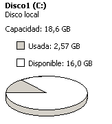 Aquest dibuix ens està dient que el disc anomenat "Disco1" té una capacitat de 18,6 Gb (gigabytes), que traduït a megabytes són uns 20.000 Mb. L'ocupació actual és de 2,57Gb, o sigui un 14% aproximadament.
