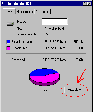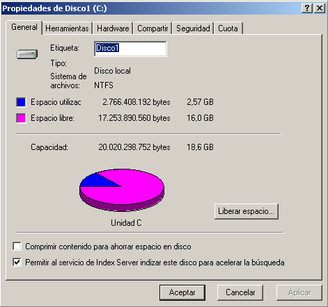 Si seleccionem l'opció "Propiedades" ens mostrarà una finestra com ara aquesta: A la primera pestanya (general) ens mostra, com podem veure, la informació que volem. (Nota : el núm. de pestanyes pot variar en funció de la versió de Windows). Serà recomanable una neteja del disc quan l'espai lliure sigui més petit d'unes 3-4 vegades el tamany de la RAM, o el que és el mateix, a partir de que ens quedin menys de 250-300 Mb de disc lliure, segons l'ordinador. Amb menys espai el Windows podrà funcionar, però ja ens estaríem apropant perillosament a un nivell crític. Com més espai lliure hi hagi, millor ens funcionarà l'accés als arxius.