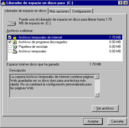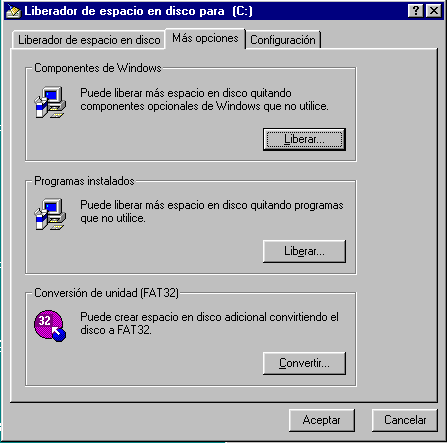 D'aquesta manera tindrem sempre ben localitzades les dades, serà mes fàcil fer-ne una copia de seguretat; evitarem que al desinstal·lar una aplicació esborrem accidentalment fitxers de dades que no calia. Per alliberar espai, les dades que utilitzem amb freqüència podem passar-les a disquet, CD etc. Si disposem de més unitats de disc dur local és convenient que no s'instal·lin sempre les aplicacions a la unitat C; és millor repartir-les en les diferents unitats de les que disposi. Si continuem en el quadre de diàleg del liberador de espacio en disco para C, i seleccionem la pestanya "Mes opcions":