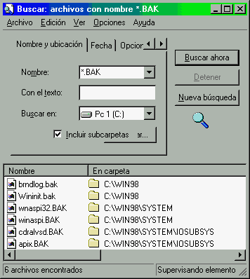 Com pots veure, en el cas que ens ocupa, el cercador ha trobat 6 fitxers, encara que normalment n'hi ha molts més. Depenent de la grandària d'aquests fitxers, podran permetre'ns alliberar molt espai en disc. Aleshores hem de repetir l'operació amb els arxius temporals, posant en el cercador de windows *.TMP. Des d'aquesta mateixa finestra els podem seleccionar