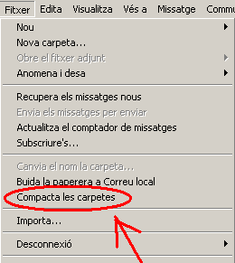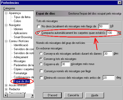 -O bé des del menú (del propi Netscape) "Arxiu" ' "Compacta les carpetes". Es realitzarà una compactació de les carpetes en aquest moment. S'haurà de repetir de tant en tant.